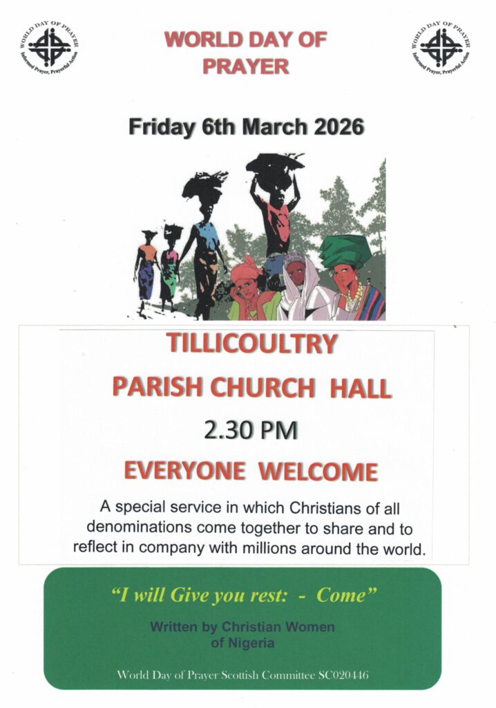 Annual World Day of Prayer Service (click here for more details) Post author:Keri Davies Post published:Sunday, 22nd February, 2026 Post category:News The Annual World Day of Prayer Service will be held in Tillicoultry Parish Church Hall on Friday 6 March at 2.30pm. You Might Also Like VISIT BY BISHOP IAN PATON Monday, 9th February, 2026 Rectory refurbishment Monday, 26th January, 2026 Lessons & Carols 6pm on Sunday 28th December Friday, 26th December, 2025