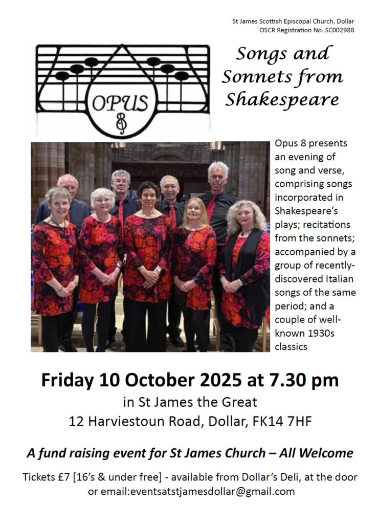 Opus 8 Concert in St James, 10th October at 7.30pm Post author:Keri Davies Post published:Sunday, 14th September, 2025 Post category:Diary Dates We are pleased and delighted to welcome OPUS 8 to St James once more. This long-established choir and have performed across Fife, as well as in Edinburgh, and toured in Amsterdam and Denmark. You Might Also Like Harvest Festival, Sunday 5th October Sunday, 14th September, 2025 St James Quiet Day: Godly Play, Saturday 27th September Tuesday, 26th August, 2025