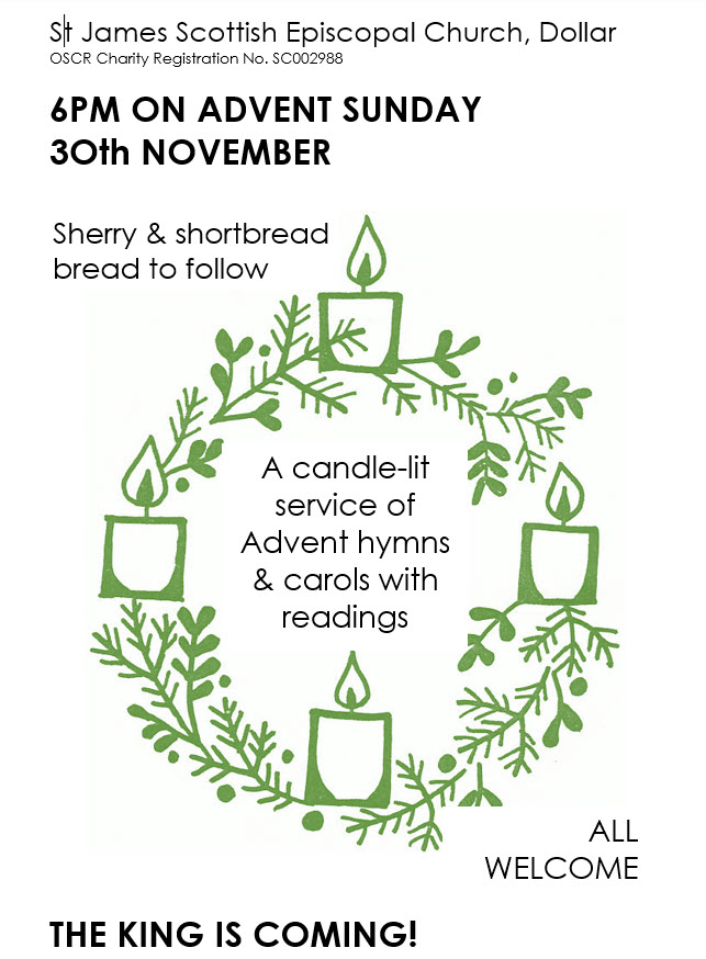Sunday 30th November, 6pm – Advent Carol Service Post author:Keri Davies Post published:Monday, 10th November, 2025 Post category:News A candle-lit service of Advent hymns and carols with readings, followed by sherry and shortbread. All welcome. You Might Also Like VE Day Celebration, Sunday 11th May Wednesday, 14th May, 2025 Nancy Colman presentation, 18th May Wednesday, 21st May, 2025 Flower Festival, Muckhart, Saturday 31st May & Sunday 1st June Monday, 2nd June, 2025
